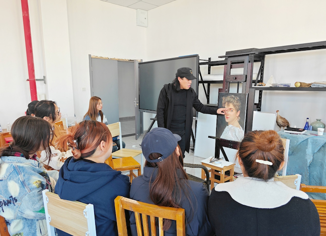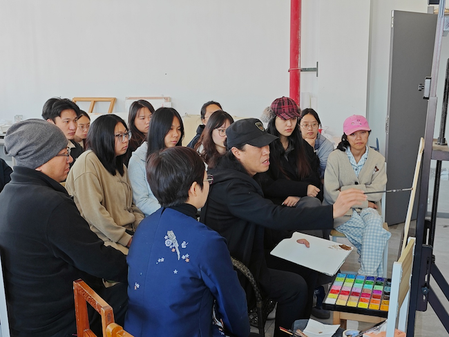 下午的油画演示则聚焦“色彩层次与情感表达”,李春华老师凭借丰富的教学与创作经验,从画布处理、颜料堆叠到光影塑造,细致呈现油画的创作流程。他分享道,油画创作讲究“厚积薄发”,既需要扎实的造型功底作为支撑,更需要在创作中融入个人对主题的理解与思考,“艺术不是对现实的简单复刻,而是通过色彩与笔触传递内心的温度与视角”。演示结束后,李老师还现场接收学生作品,从专业角度进行一对一点评,既肯定亮点之处,也精准指出构图、色彩、技法等方面的改进方向,提出具体可行的优化建议。